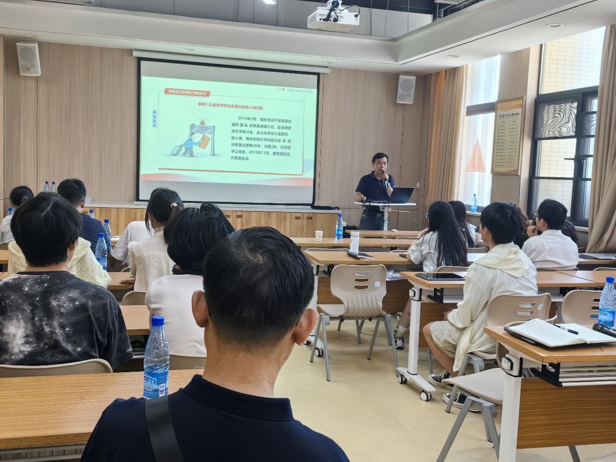 韩书记与师生党员一起重温了《条例》中关于总体要求、工作原则、监督执纪“四种形态”、纪法衔接条款等内容后,带领大家深入细致学习了《条例》中关于违反政治纪律、违反组织纪律、违反廉洁纪律、违反群众纪律、违反工作纪律和违反生活纪律等六大纪律的内涵、修订条款内容及负面清单,并辅以案例分析,深入浅出,生动易懂,帮助师生党员更加深入理解党的纪律是管党治党的“戒尺”,要“严守党的纪律”。