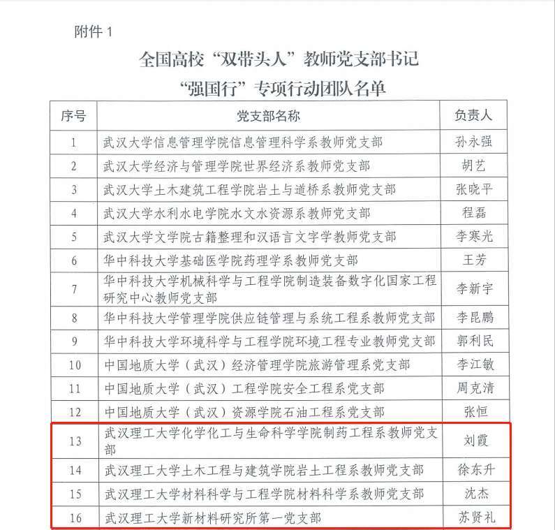 近日,教育部办公厅和湖北省委教育工委分别公布了全国和全省高校“双带头人”教师党支部书记“强国行”专项行动团队名单,公司制药工程系教师党支部入选全国高校“双带头人”教师党支部书记“强国行”专项行动团队。