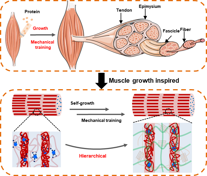 Muscle tissue is one of the toughest anisotropic tissues in the human body. Its exceptional mechanical properties arise from its unique hierarchical fiber structure. The formation of these multi-level fiber structures involves two fundamental biological processes: i) Absorption and conversion of external nutrients; ii) Mechanical training, which transforms the absorbed nutrients into fibrous structures, thereby strengthening and toughening the muscle tissue. Additionally, during muscle growth, existing fiber structures undergo loss and rupture. Subsequent nutrient absorption and mechanical training lead to fiber thickening and reconstruction, resulting in increased muscle size and enhanced load-bearing capacity. Inspired by this natural growth process, researchers have developed mechanical training-promoting fiber structure in-situ generated hydrogel and force promoted self-growing hydrogel. The mechanical properties of all those hydrogels can be enhanced after mechanical training. However, in these hydrogels, the role of force is mainly to generate fiber structure in situ in various isotropic hydrogels (mechanical training promotes structural transformation), or to promote polymerization reaction (mimicking the growth of muscle matrix). Currently, the strategy of simulating muscle growth is still difficult to perfectly replicate the process of muscle growth, i.e., matrix growth and mechanical training-promoting structural transformation.