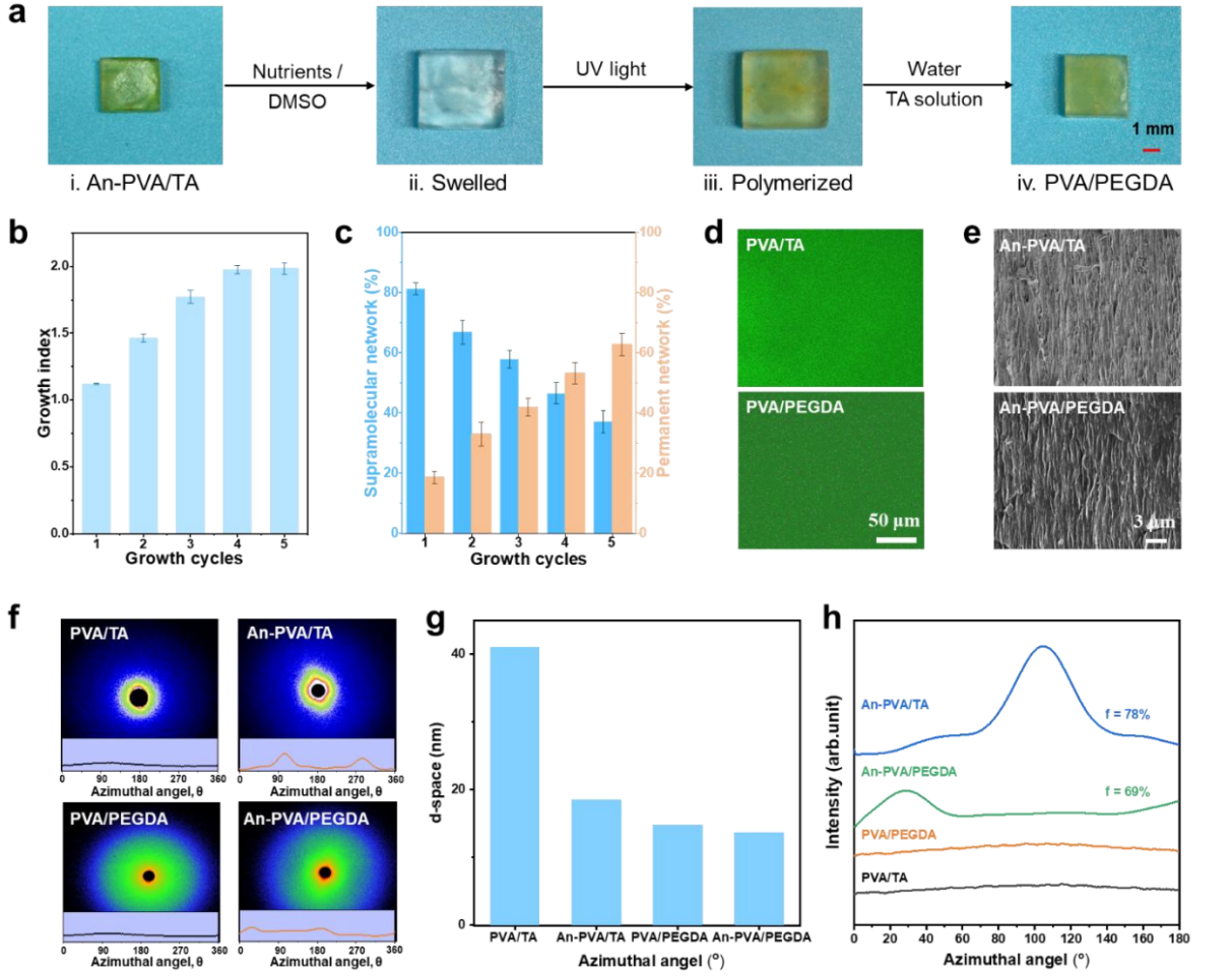 Fig. 3. Structural Evolution and Mechanical Properties of Self-Growing Anisotropic Hydrogels. Image source: Adv. Mater.