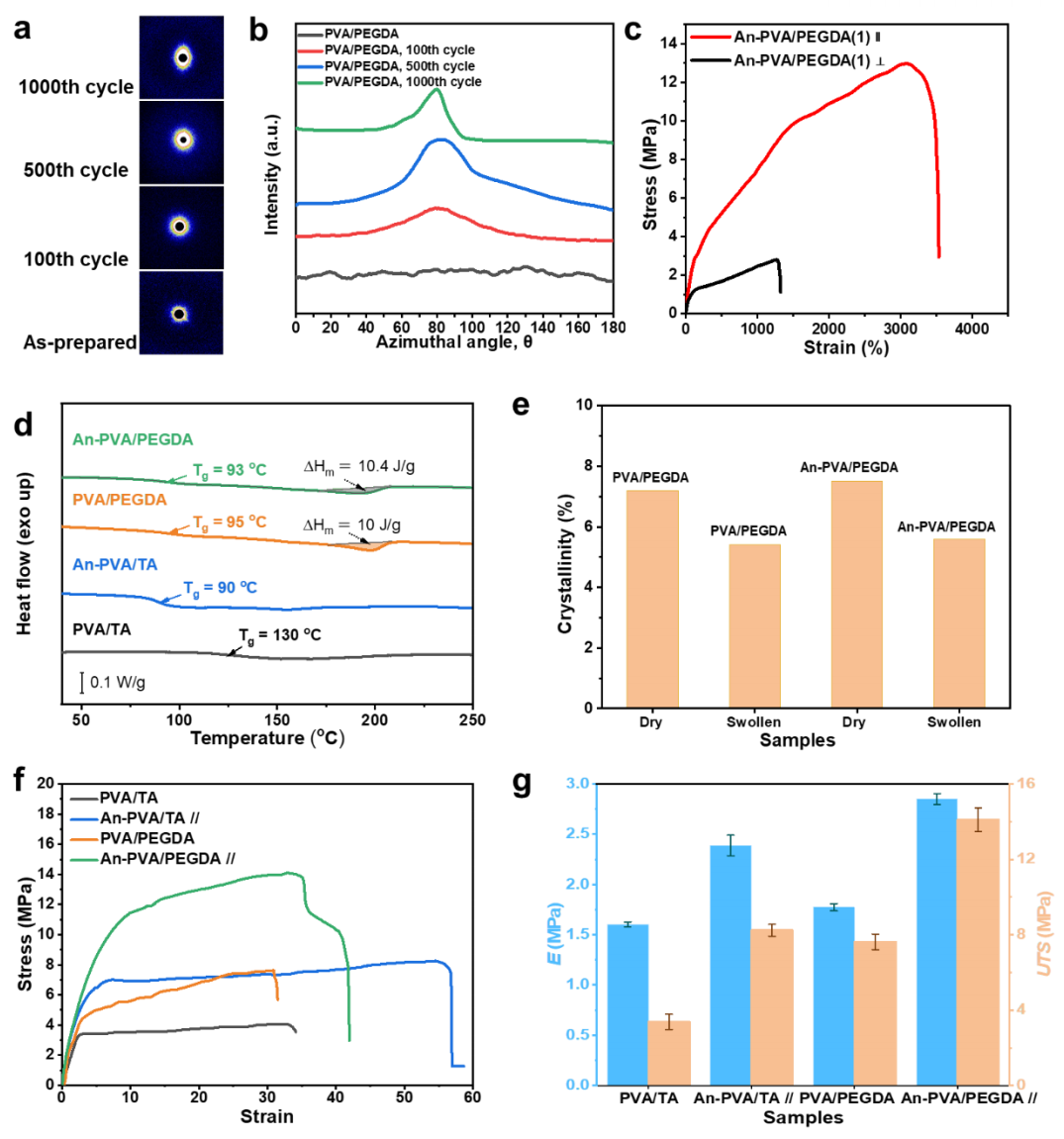 Then, this paper further discusses the mechanism of structural transformation promoted by mechanical training, and tracks the microstructure of hydrogel under different training times. SAXS results show that the orientation structure inside the hydrogel becomes more obvious with the increase of training times (Fig. 3). Subsequently, this paper further studied the aggregation state and mechanical properties of An-PVA/TA hydrogel during growth and mechanical training, and discussed its effect mechanism (Fig. 3). The relationship between microstructure, toughness and fracture toughness of hydrogels is established (Fig. 4), and the maximum tensile strength and fracture toughness of An-PVA/PEGDA hydrogels prepared in this study are compared with those of current tough hydrogels (for example, dual-network microphase separation hydrogels, directional casting and salting-out hydrogels).