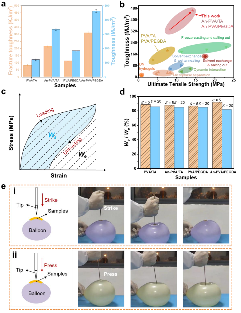 Finally, the energy dissipation capacity of the hydrogels and their application in impact protection were evaluated. The results show that the energy dissipation efficiency of the hydrogels after mechanical training can reach 90% under low strain conditions. Because of their good energy dissipation efficiency, the hydrogels can effectively resist the impact of static force and dynamic force. When the hydrogels are stuck on the surface of the inflatable balloon as a protective material, the balloon can still be inflated without being damaged when it is impacted by a sharp needle (Fig. 4). This also verifies the potential application of the hydrogels as protective materials since they show good impact resistance.