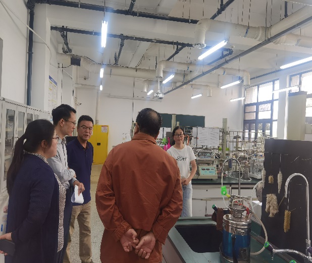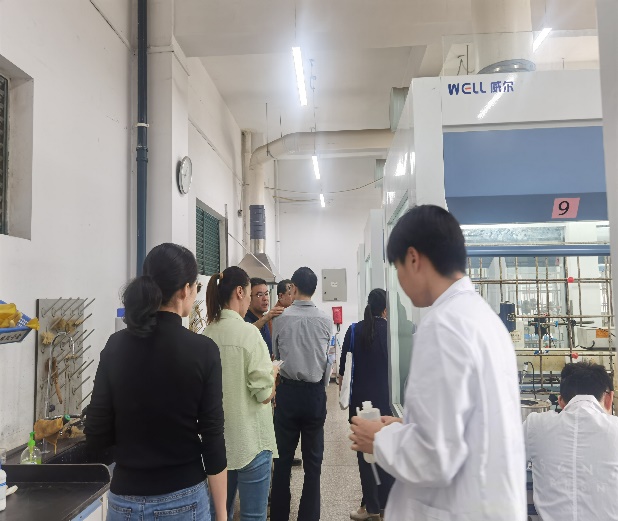 随后周经理一行到化学楼基础化学实验室参观,并进入正在开展实验的应化专业综合实验室查看实验教学实际运行情况,对公司基础化学实验室数量、设备台套数、排课基本情况、教师指导情况进行了解。
