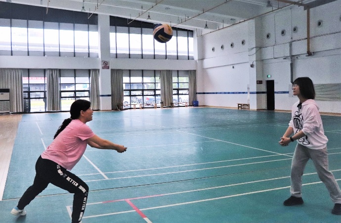 图为刘霞老师在业余时间和员工一起打排球