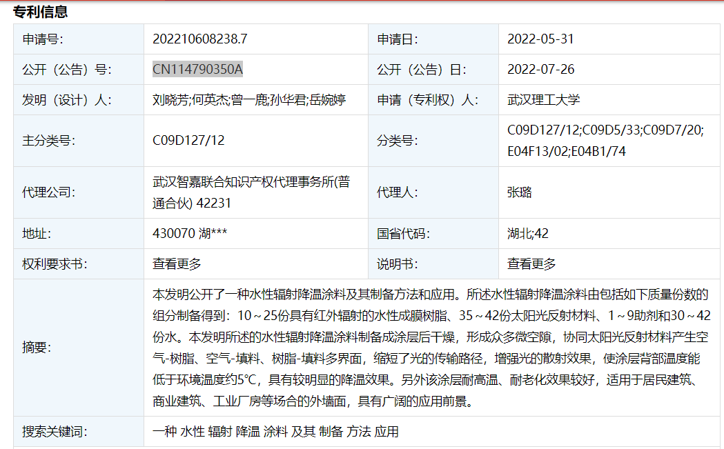 刘晓芳;何英杰;曾一鹿;孙华君;岳婉婷, 一种水性辐射降温涂料及其制备方法和应用, CN114790350A