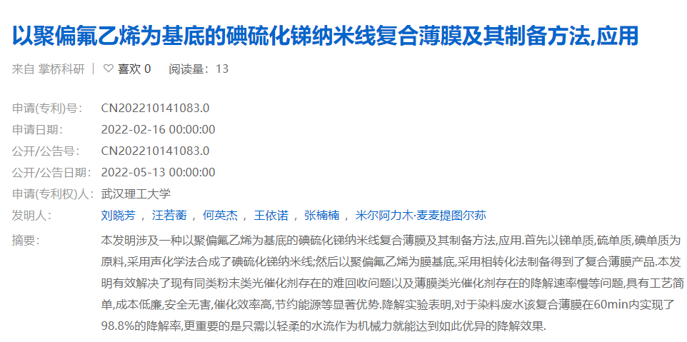 申请,以聚偏氟乙烯为基底的碘硫化锑纳米线复合薄膜及其制备方法、应用,202210141083.0