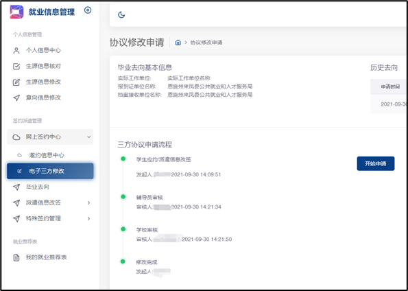 员工应约后,单位需要向员工出示一份盖章的情况说明,写清楚要修改的字段内容。员工在系统中点击进入“电子三方修改”模块,点击“开始申请”,提交盖章的情况说明并在系统中进行修改,经公司审核后完成修改。
