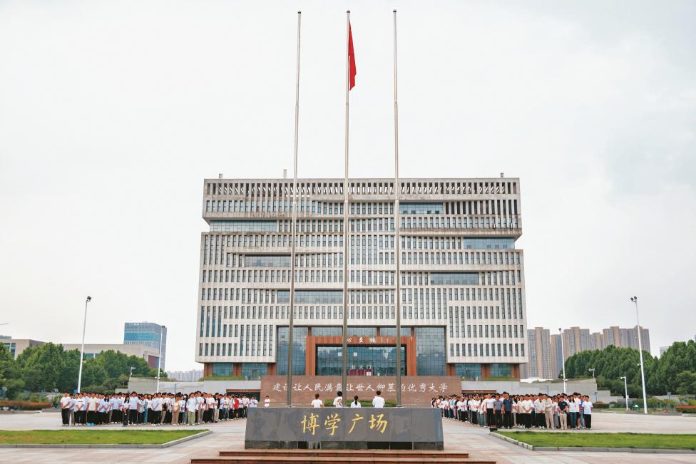当第一缕金色晨晖浸染天际,校国旗仪仗队戎装笔挺、英姿飒爽,踏着掷地有声的正步,以雷霆之势护卫五星红旗庄严入场。随着《义勇军进行曲》雄浑的旋律响彻苍穹,升旗手利落挥臂间,鲜艳的旗帜如红霞破晓般凌空舒展,在晨风中划出壮美弧线。全体师生列阵如松肃穆凝望,目光如炬齐声高唱,穿云裂石的国歌声激荡在每个人的心间,汇聚成澎湃的赤子热忱。