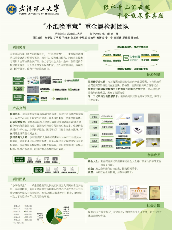 在张甜、肖静老师的指导和国家老员工创新创业项目的支持下,团队成员历经三年攻坚克难,突破现有技术,设计适配重金属离子检测的纤维素结构,实现了水质中重金属离子的快速检测,引领水质快速检测和重金属离子检测技术的发展,助力绿水青山和环境保护。