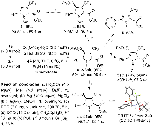 TapTap黄毅勇教授课题组致力于手性含氟杂环化合物的催化不对称合成方法学研究,针对含三氟甲基多取代四氢吡咯化合物的重要性和合成难题,以及芳香砜基在后续衍生化过程中的重要性,巧妙设计合成了一类新型含三氟甲基不饱和砜类化合物,并将其应用于甲亚胺叶立德的1,3-偶极环加成反应中。采用商业易得(S)-tol-BINAP/Cu(OAc)2配合物作为催化剂(最低负载量为0.5 mol%),含不同取代基的亚胺酸酯及含氟烷基不饱和砜都可以在此类反应中得到应用。最终,以最高97%产率,大于99:1的非对映选择性比例(exo:endo)和98:2的对映选择性比例得到多种含氟烷基手性四氢吡咯化合物。该课题组还进一步与材料科学与工程国际化示范公司赵焱教授合作,通过密度泛函理论(DFT)和非共价键相互作用(NCI)计算方法,对此反应的反应历程和优势立体选择性诱导机制进行了解释,并提出了可能的反应机理。该反应可以扩大至克级反应规模,催化剂的用量可以降低至0.5 mol%,这充分说明该方法具有十分重要的实际合成应用价值。此外,催化产物通过不同反应条件可以得到含三氟甲基二氢吡咯和吡咯类杂环化合物。尤其重要的是,exo型催化产物经DBU简单处理后可得到其差向异构体(exo’),实现了非对映发散式合成(最高95%产率,65:1 dr和99:1 er)。