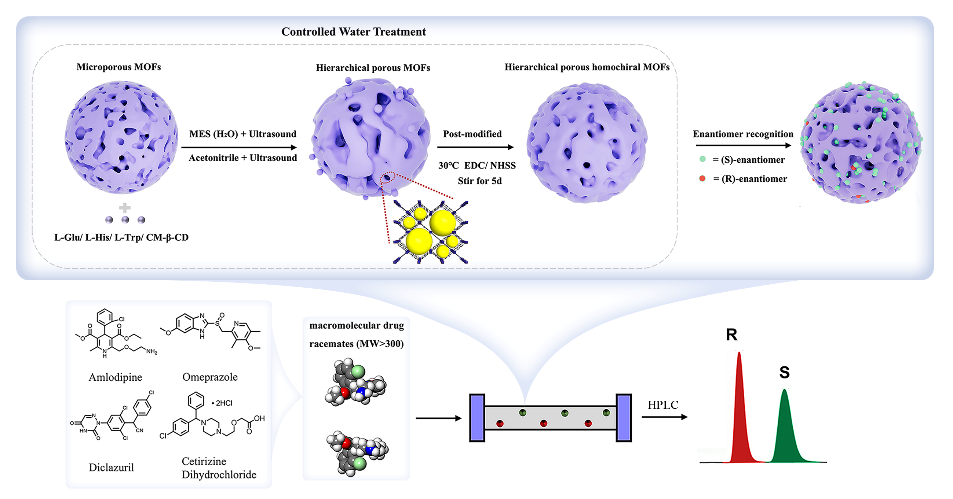 同手性金属有机框架材料(HMOFs)近年来被报道可用于手性分离领域,然而针对具有大分子量和复杂结构的手性药物的有效拆分研究仍极为匮乏,这类药物拆分既具有重要应用价值又更具挑战性。由于多数MOFs材料受限于微孔结构,体积较大的手性药物分子难以进入孔道实现手性识别,这使得分级孔MOFs(HPMOFs)成为新兴研究方向。本研究创新性地采用高强度超声辅助的可控水处理策略调控DUT-5-NH2的动力学水解过程,结合后合成修饰技术在有机框架内接枝手性氨基酸和羧甲基-β-环糊精(CM-β-CD),成功构筑了具有对映选择性的分级孔同手性HPHMOFs材料。所制备的多功能HPHMOFs在保持材料优异结构稳定性与循环性能的前提下,可同时实现吸附选择性拆分、固相萃取拆分乃至色谱柱拆分,对多种药物对映体表现出良好的手性识别能力。这一成果凸显了HPHMOFs材料应对复杂手性分离需求的普适性与高效性。通过分子动力学模拟与量子化学计算的协同分析,揭示了主-客体间氢键作用、范德华力、空间位阻等弱相互作用,以及接枝分子的立体化学结构产生的立体选择效应共同制约着手性识别过程。其中,氢键的空间分布、键合数量及作用强度对所制备材料的对映体分离性能影响最为显著。理论计算进一步阐明,在四类HPHMOFs材料中CM-β-CD接枝的HMOFs展现出最优对映体分离能力的分子机制。特别值得关注的是,HPHMOFs与药物对映体间的吸附能和相互作用能差异与其手性拆分能力具有良好一致性。本研究首次成功实现了HPHMOFs对大分子手性药物(分子量超过300 Da)的对映体选择性拆分,为拓展手性分离材料的应用边界提供了理论支撑与技术范式。